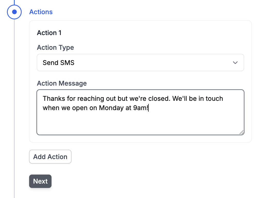 #7 Set Action Type as “Send SMS” and the message you’d like to reply with